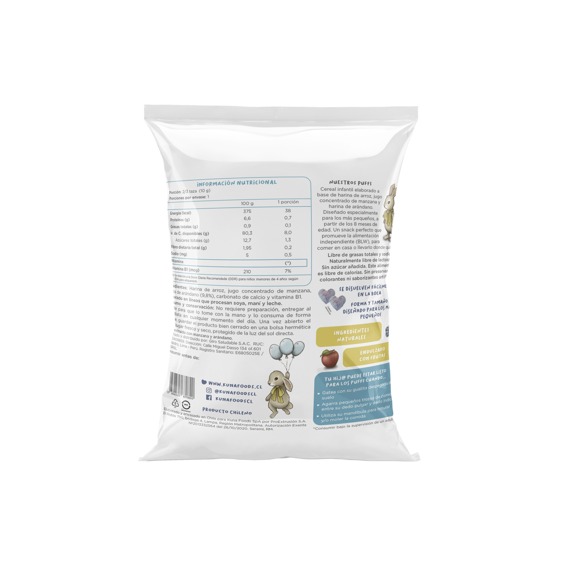 Snack saludable a base de harina de arroz, jugo concentrado de manzana y harina de arándanos. Apto para consumo a partir de los 8 meses de edad.
